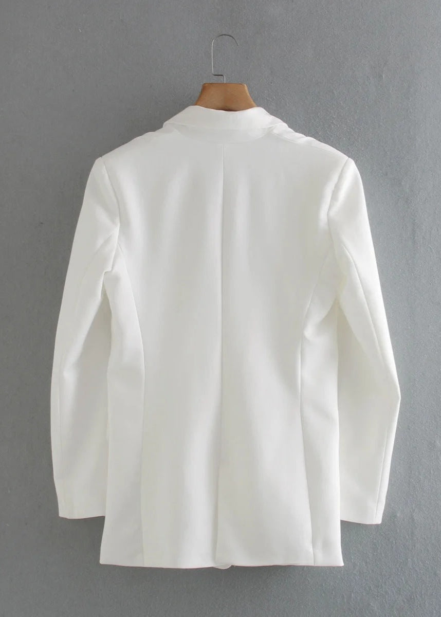Apportez une touche sophistiquée à votre garde-robe avec ce blazer blanc à la coupe inspirée du style britannique. Son design structuré, rehaussé de boutons dorés, incarne l’équilibre parfait entre raffinement et modernité.