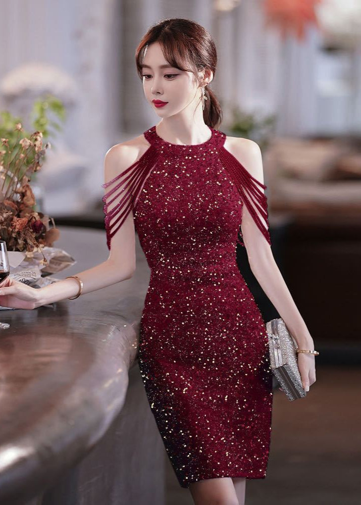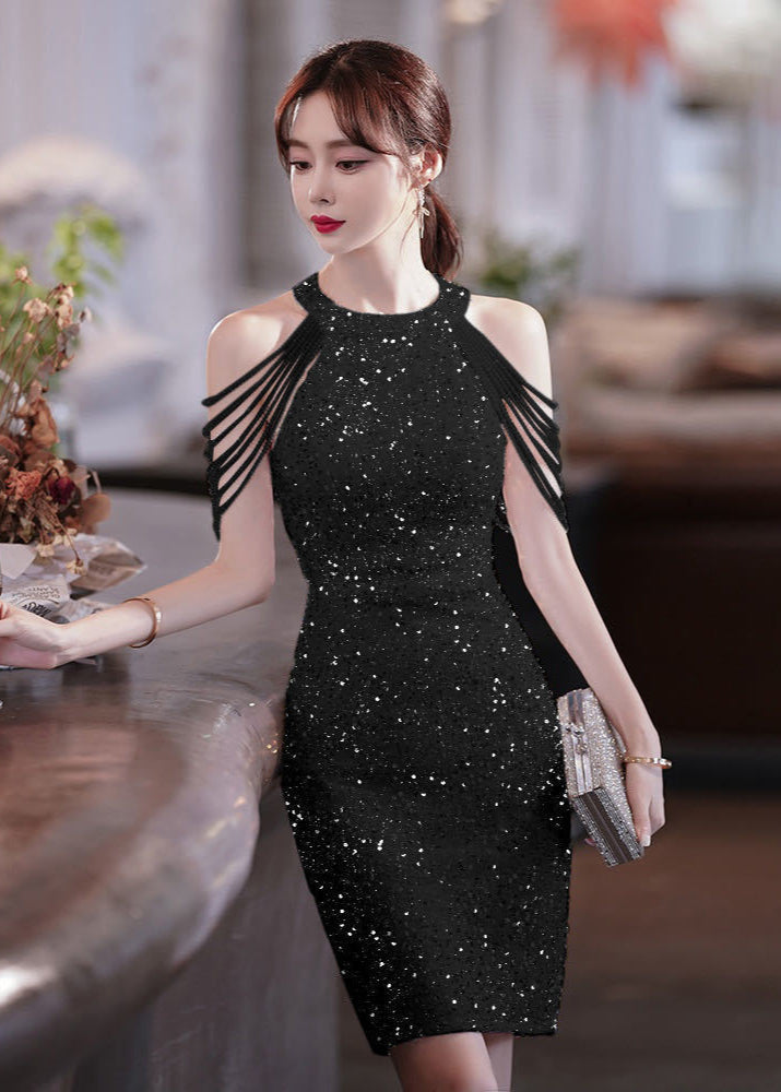 - Détails : Épaules dénudées avec perles décoratives, coupe courte moulante