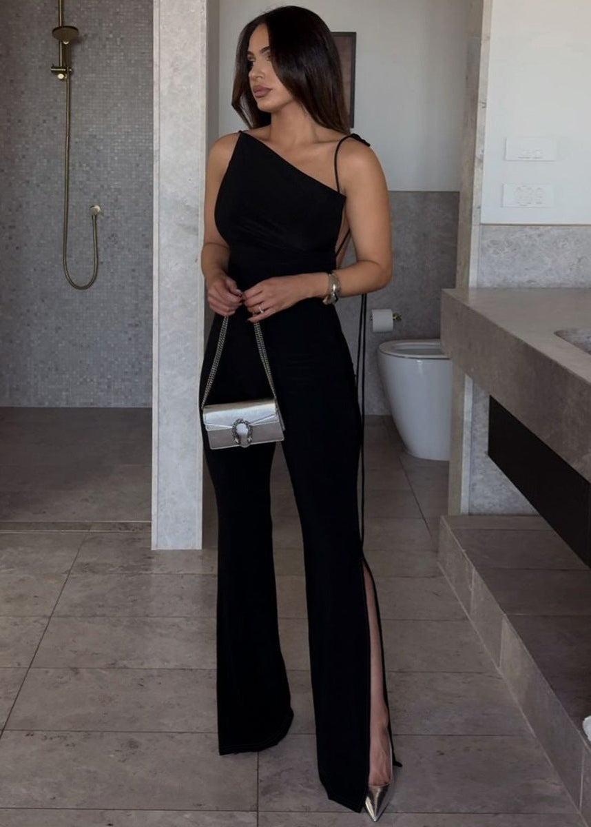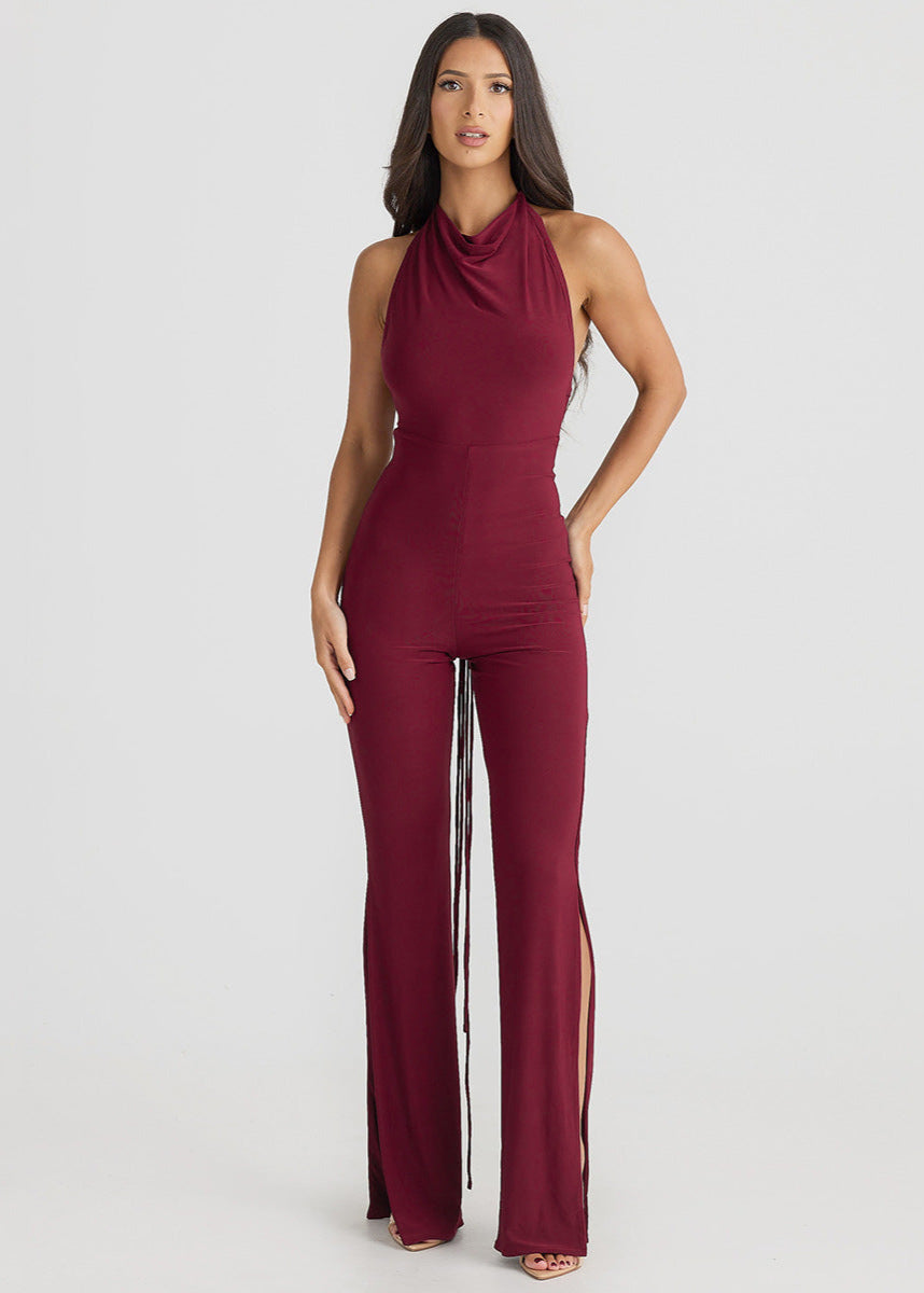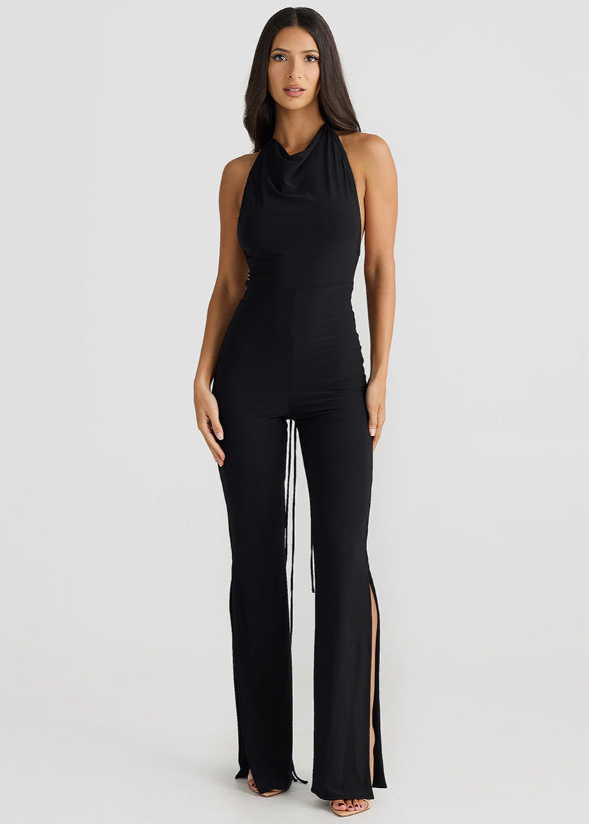 Transformez chaque apparition en moment inoubliable avec cette combinaison dos nu ultra féminine. Grâce à ses longues lanières modulables, vous pouvez ajuster le haut en plusieurs styles (asymétrique, col drapé, bustier ou noué autour du cou). Son tissu fluide épouse parfaitement les courbes, tandis que les fentes en bas des jambes ajoutent une touche sensuelle.